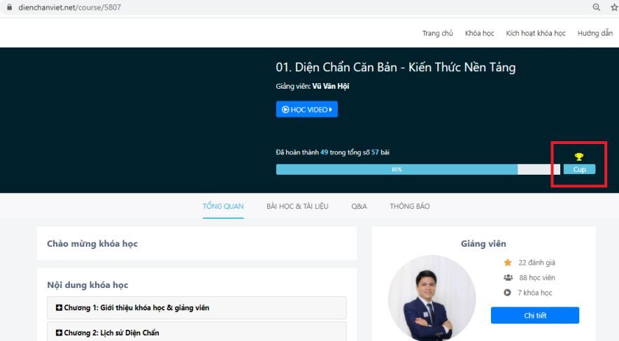 Chứng nhận sẽ xuất hiện sau khi bạn hoàn thành được 80% số bài học trong khóa học (được hiển thị trên tiến độ hoàn thành bài giảng), ngay phía dưới biểu tượng Cup sẽ đổi màu vàng. Bạn bấm vào là tải chứng nhận về. Chứng nhận vẫn có ở đây và bạn có thể tải về nhiều lần.